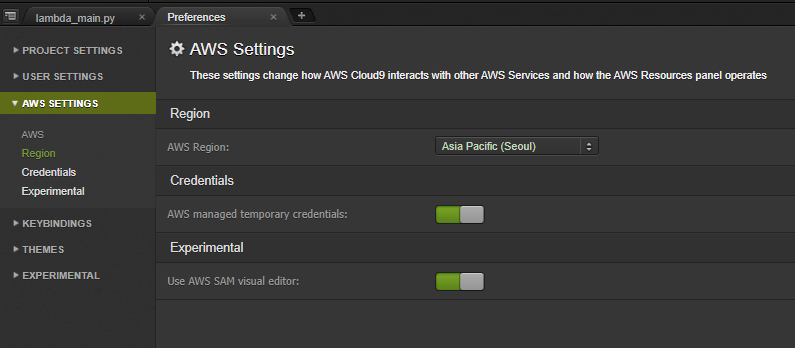 만약 SAM Application이 아닌 단순 스크립트를 Lambda에 배포를 원할 경우에는 아래 이미지와 같이 Preferences -> AWS Settings에서 AWS Toolkit 옵션을 끄고 Cloud9을 재실행하면 된다.