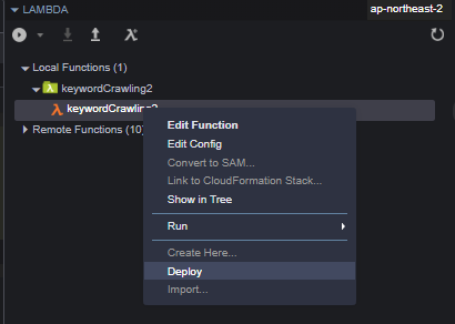 또한 Lambda 배포용으로 C9을 쓴다면 미리 C9을 통해 Lambda Function을 생성하고, C9 내의 Lambda 기능을 통해 디버깅 해야 한다.