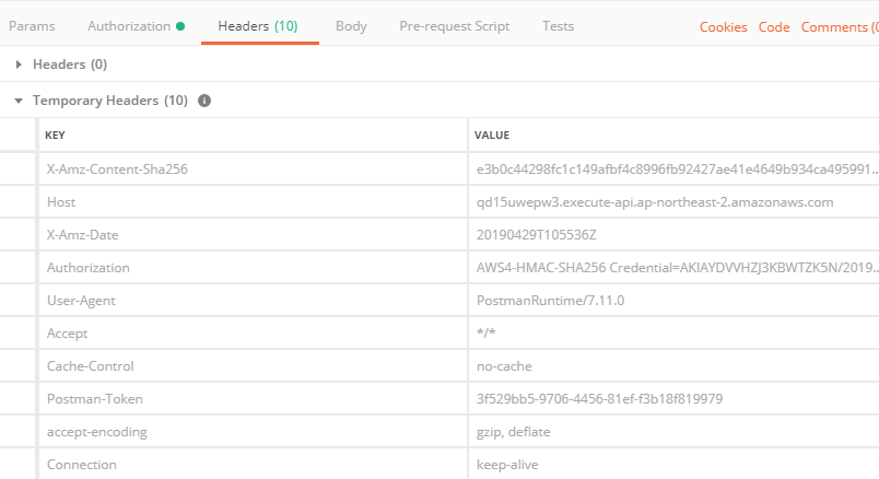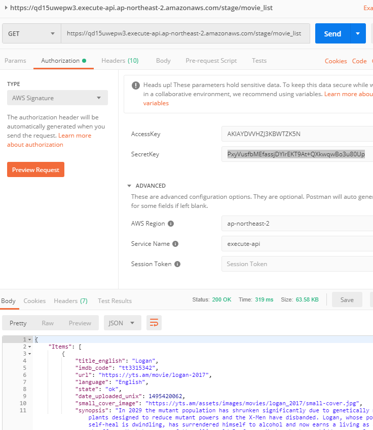 Access/Secret Key, Region, Service Name 정보를 입력하고 GET 요청을 하면 아래와 같이 Authorization Header 값을 추가하여 API Gateway로 요청을 보내고, 성공적으로 Data를 받아올 수 있다.
