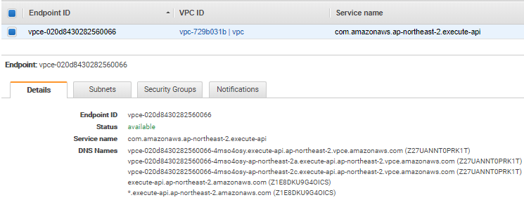 VPC End Point 생성 시 EC2 Network Interfaces에서 지정한 Subnet에서 두 개의 ENI가 생성된 것을 확인할 수 있다. 또한 VPC 콘솔에서 End Point에 대한 URL을 확인할 수 있다. 해당 URL로 질의하면 생성된 VPC의 내부든 외부든 생성된 사설 ENI의 IP주소를 받을 수 있다.