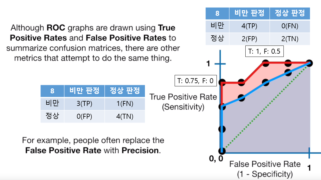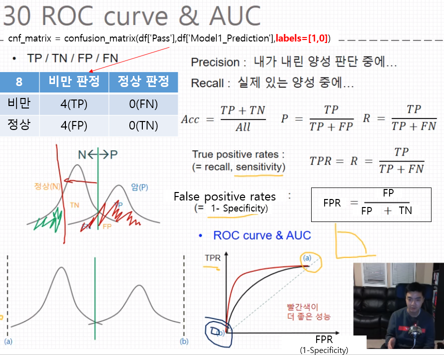 Accuracy(전체 적중률 TP+TN/ALL), Percision(예상에서 적중률 TP/TP+FP), Recall(실제에서 적중률 TP/TP+FN),