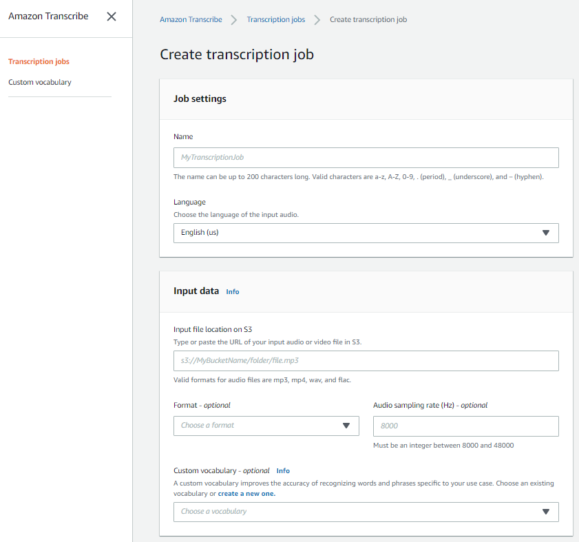 오디오 컨텐츠는 API 호출당 컨텐츠 길이 4시간이나 2GB로 제한된다. 따라서 동영상 파일의 경우 MediaConvert를 사용해서 음성 파일만 따로 추출하는 것을 권장한다. 아래 링크를 걸어둔다.