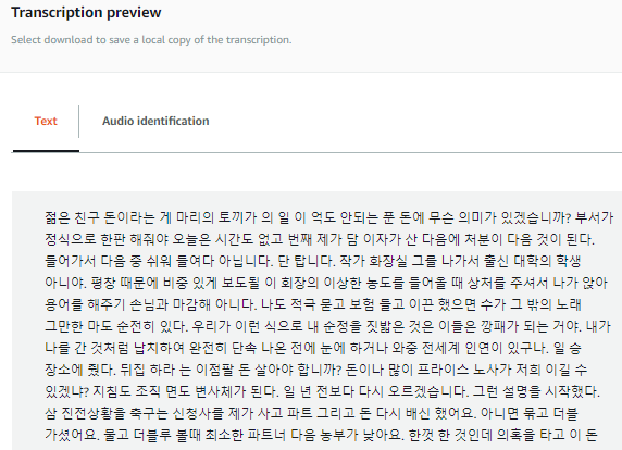 결과는 아래와 같이 Text나 화자가 분류된 Audio identification 형태로 확인할 수 있다.
