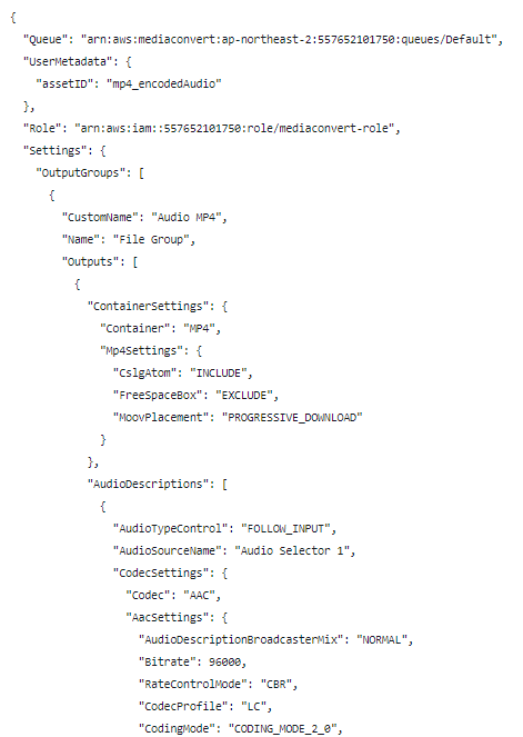 그럼 필요한 부분은 JSON에서 OuputGroups 항목만 빼서 샘플코드에 job.json 항목만 변경시켜주면 VOD에서 음성만 변환하여 가져올 수 있다. S3 output 경로라든지 기타 필요한 기능은 샘플코드를 조금 수정해주면 된다.