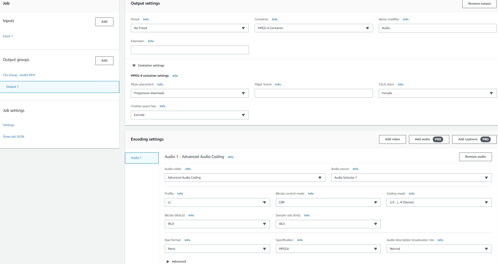 그럼 우리는 음성만 추출하기 위한 프로파일(JSON)이 필요하다. 프로파일을 바로 만들기에는 파라미터가 너무 복잡하기 때문에 먼저 웹 콘솔에서 Audio 만 뽑기 위한 프로파일을 생성하고 테스트 해보도록 한다.