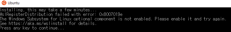 The Windows Subsystem for Linux optional component is not enabled. Please enable it and try again.