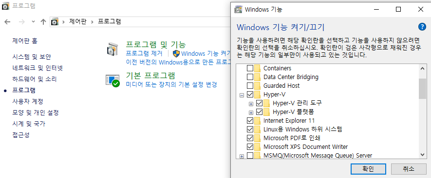1. Windows 기능에서 Linux용 Windows 하위 시스템을 활성화