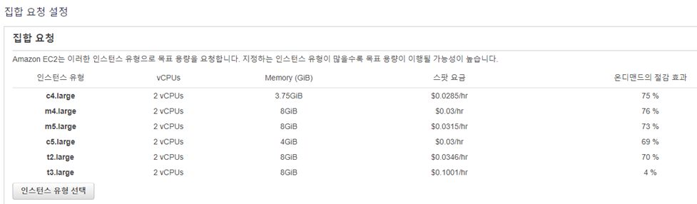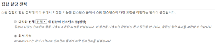 스팟 집합에서 온디맨드 용량을 채우려고 시도하는 경우 기본적으로 최저 가격의 인스턴스 유형을 먼저 시작한다.