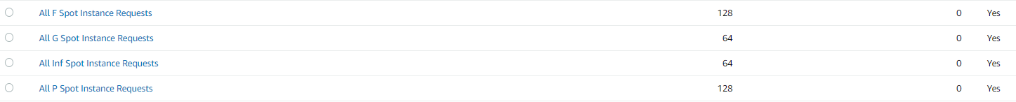 초기 다수의 스팟 요청이 실패할 수 있는데, 보통 스팟 제한으로 인해 발생된다. 가시적으로 스팟 제한 가용량을 확인하기 위해서는 Service Quotas -> EC2 항목에서 각 타입에 맞는 스팟 인스턴스 vCPU 할당량을 확인할 수 있다.