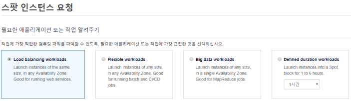 Defined duration workloads : 1~6시간 동안의 스팟 블록(지정된 지속시간) 인스턴스 사용.