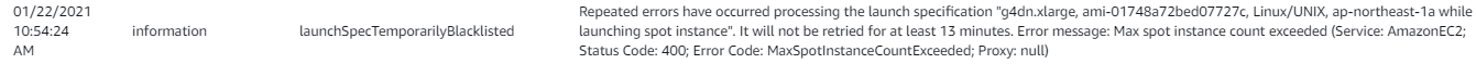 Repeated errors have occurred processing the launch specification "g4dn.xlarge, ami-01748a72bed07727c, Linux/UNIX, ap-northeast-1a while launching spot instance". It will not be retried for at least 13 minutes. Error message: Max spot instance count exceeded (Service: AmazonEC2; Status Code: 400; Error Code: MaxSpotInstanceCountExceeded; Proxy: null)