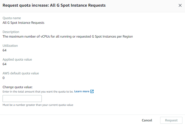 초기 다수의 스팟 요청이 실패할 수 있는데, 보통 스팟 제한으로 인해 발생된다. 가시적으로 스팟 제한 가용량을 확인하기 위해서는 Service Quotas -> EC2 항목에서 각 타입에 맞는 스팟 인스턴스 vCPU 할당량을 확인할 수 있다.