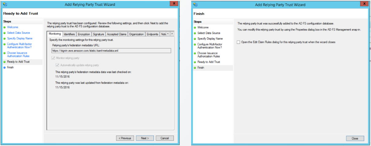 - Finish 화면에서 Open the Edit Claim Rules dialog for this relying party trust when the wizard closes에 체크를 풀고 Close를 클릭한다.
