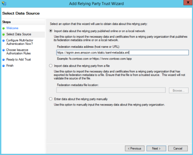- Step3: Establis Trust에서 SAML provider를 ADFS로 선택하고 Next Step을 클릭한다.