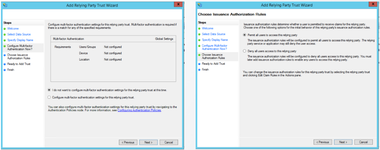 - Choose Issuance Authorization Roles는 Permit all user to access this relying party를 선택한 후 Next 버튼을 클릭한다.
