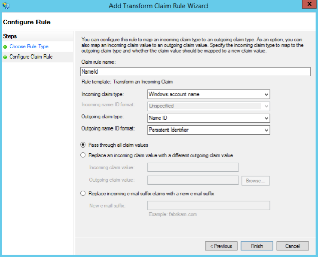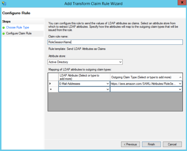 - Configure Claim Rule에서 다음과 같이 입력한 후 Finish를 클릭한다.