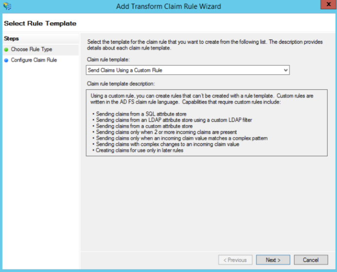 - Add Transform Claim Rule Wizard 창이 뜨면 Choose Rule Type에서 Send Claims Using a Custom Rule을 선택하고 Next를 클릭한다.