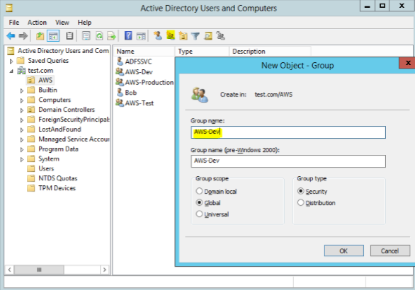 Active Directory Users and Computers Console이 뜨면 Group을 아래와 같이 생성한다.