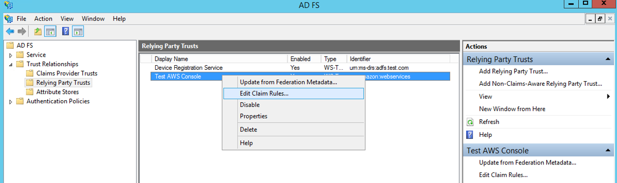 - AD FS Console이 뜨면 왼쪽 Navigator에서 ADFS -> Trust Relationships -> Relating Party Trusts를 선택한다.