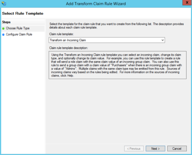 - Add Transform Claim Rule Wizard 창이 뜨면 Choose Rule Type에서 Transform an Incoming Claim을 선택하고 Next를 클릭한다.