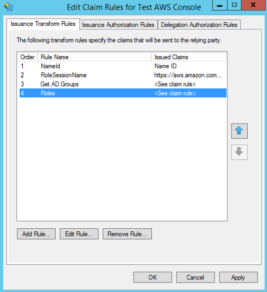 - Edit Claim Rules for <Relying Party Trusts Name> 창의 Issuance Transform Rules 탭에서 다음과 같이 NameId, Role SessionName, Get AD Groups, Roles가 있는 지 확인 후 OK 버튼을 클릭한다.