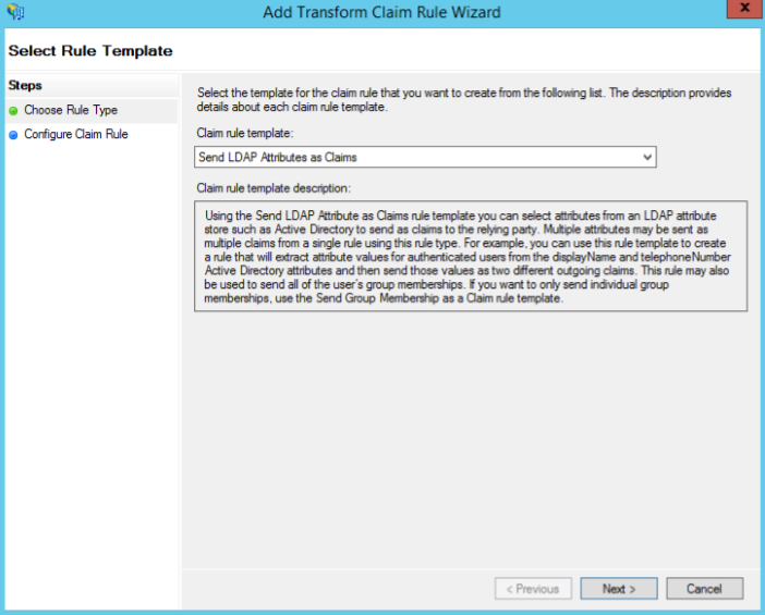 - Add Transform Claim Rule Wizard 창이 뜨면 Choose Rule Type에서 Send LDAP Attributes as Claims을 선택하고 Next를 클릭한다.