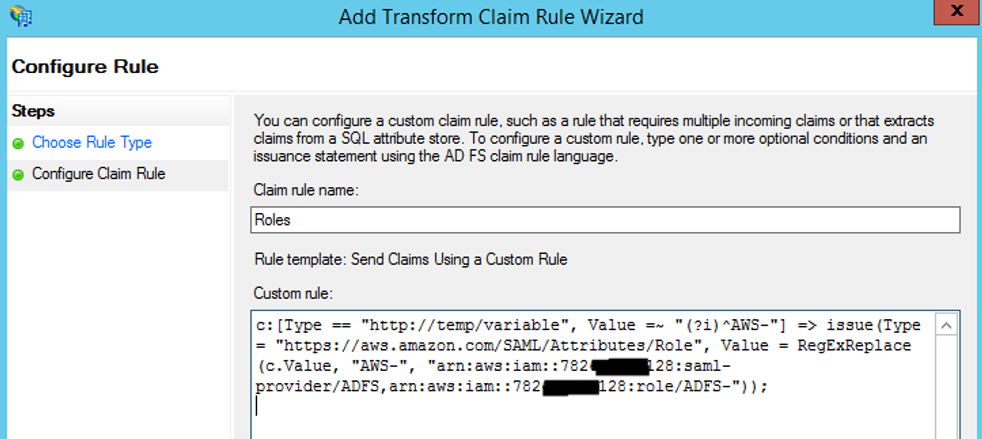 c:[Type == "http://temp/variable", Value =~ "(?i)^AWS-"] => issue(Type = "https://aws.amazon.com/SAML/Attributes/Role", Value = RegExReplace(c.Value, "AWS-", "<AWS IAM Identity Providers ARN>,arn:aws:iam::<AWS Account NO>:role/<AWS Role에서 생성한 접두사 (ex: ADFS-)>"));