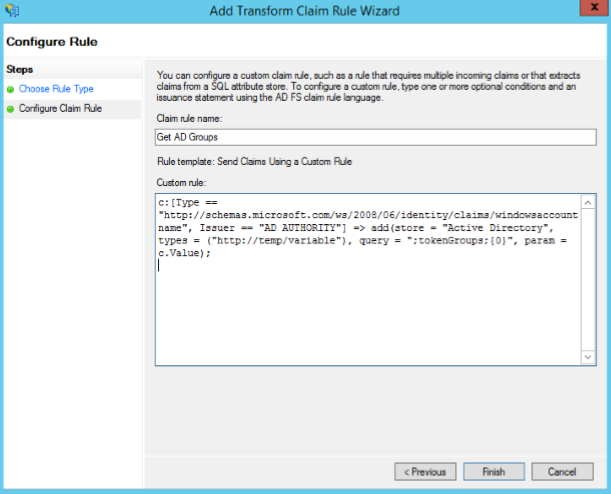 c:[Type == "http://schemas.microsoft.com/ws/2008/06/identity/claims/windowsaccountname", Issuer == "AD AUTHORITY"] => add(store = "Active Directory", types = ("http://temp/variable"), query = ";tokenGroups;{0}", param = c.Value);