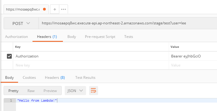 그럼 Postman 혹은 CURL을 통해 이전 TEST와 동일하게 HTTP Request를 API Gateway에 날리자.