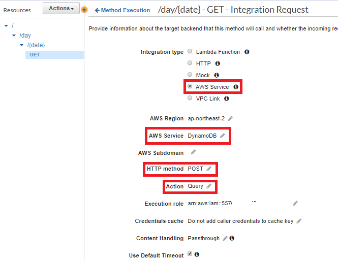 여기서 주의사항의 경우 API Gateway Method 부분에서 HTTP Method를 POST로 지정해야 한다. 또한 Action에서도 GetItem, PutItem, Query 등 사용하고자 하는 DynamoDB Function을 기입해야 한다.