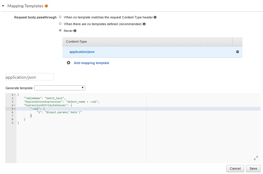 아래 매핑 템플릿의 경우는 Hash Key 값이 object_name인 Dyanamodb batch_test 테이블에 Query Get 요청을 하는 경우다.