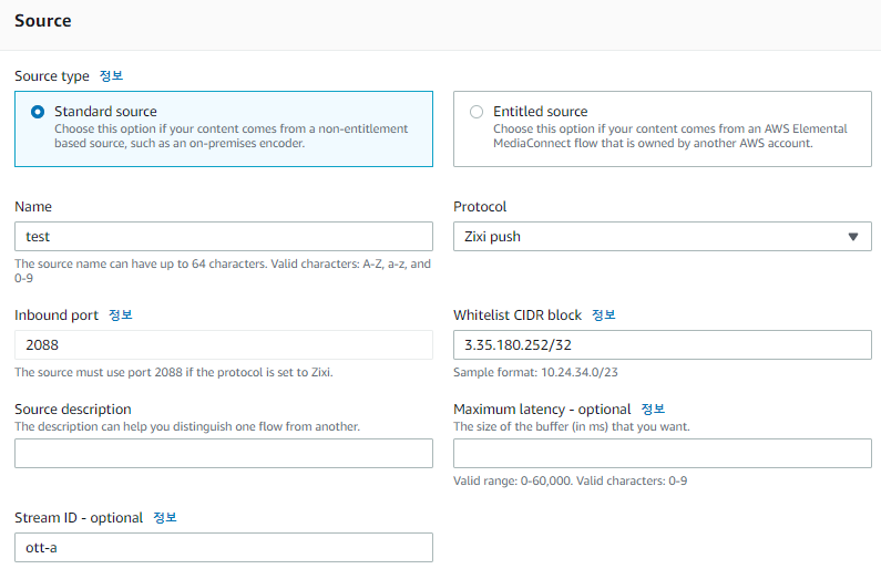 그리고 동일하게 위와 같이 싱가폴 리전에 미디어커넥트를 생성한다. 여기서 Zixi push를 선택하고 서울리전 미디어커넥트의 IP를 입력한다.