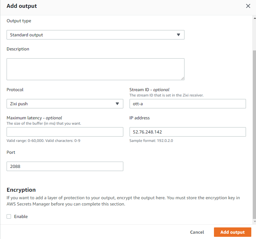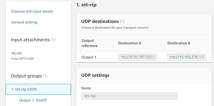 만약 AWS 미디어라이브를 사용한다면 서울 리전에서 미디어라이브 아웃풋 프로토콜은 아래와 같이 UDP를 사용하면 된다.