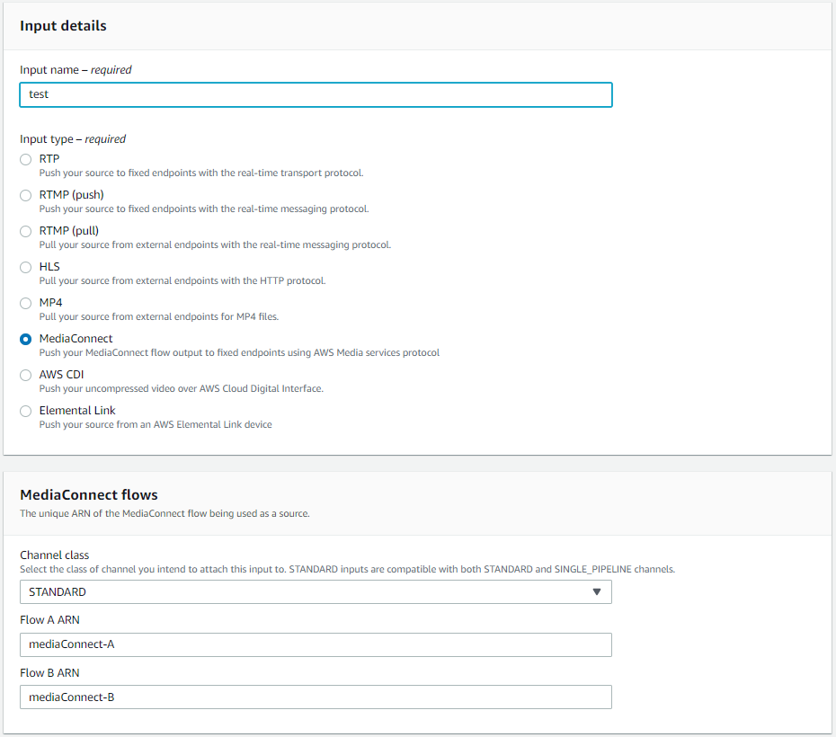 Source의 경우 MediaLive를 통해 받기 때문에 Standard source를 선택한다.