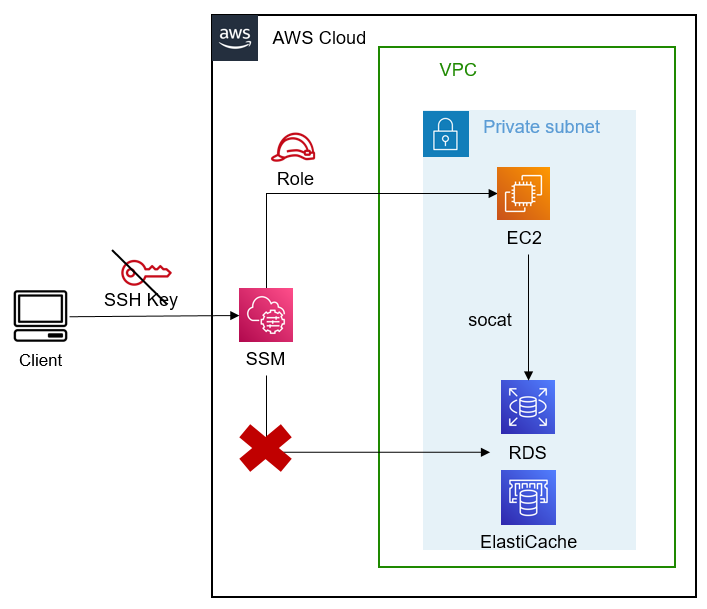 이럴 경우 AWS SSM의 포트포워딩 기능과 리눅스 socat 패키지를 이용하면 로컬에서도 AWS Private 내의 PaaS에 접근이 가능하다.