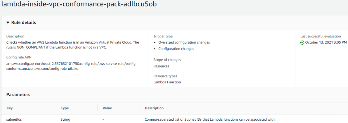 그럼 한 가지 예로 마지막에 있는 lambda-inside-vpc-conformance-pack을 보겠음