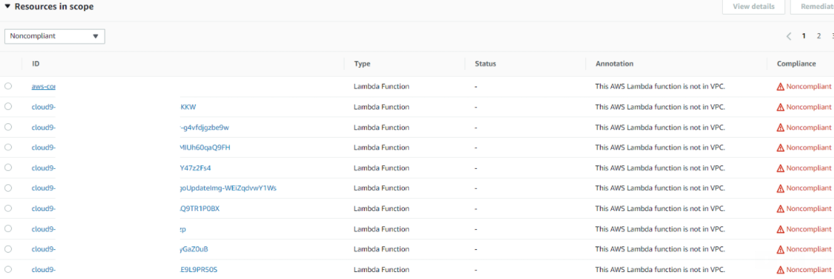 해당 규정을 지키지 않고 있는 lambda-inside-vpc-conformance-pack을 설명을 보면,