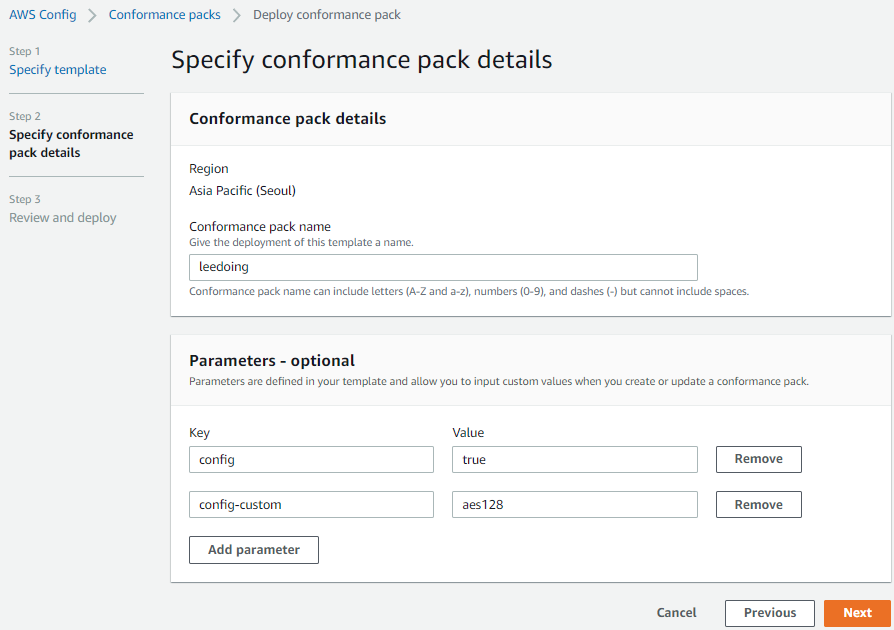 AWS Console -> AWS Config -> Conformance packs 에서 Deploy conformance pack 클릭