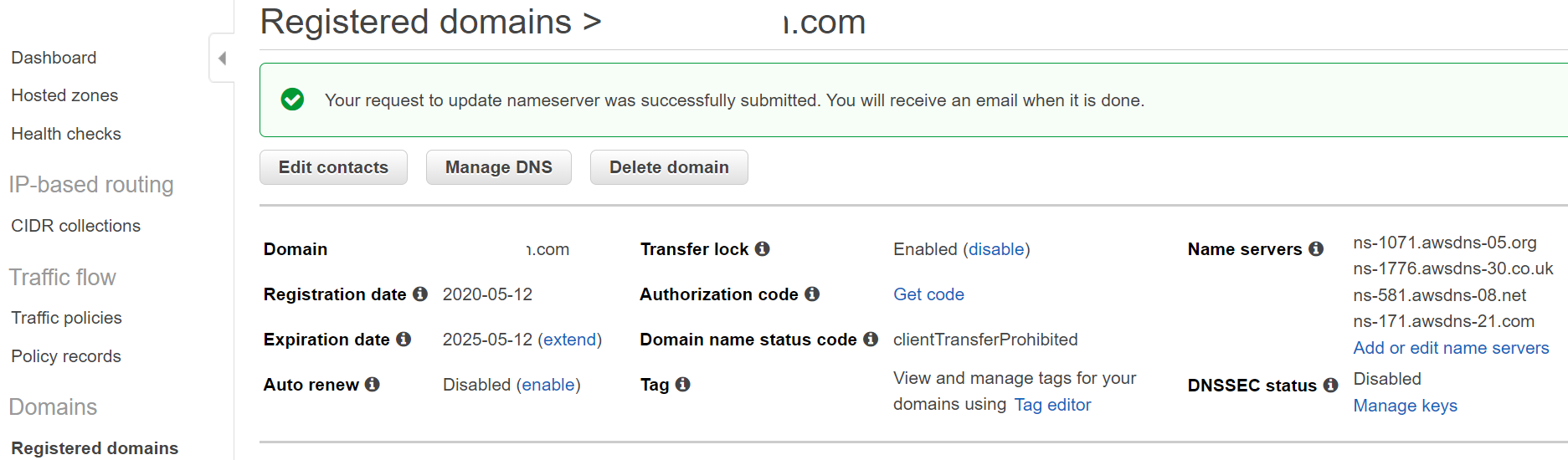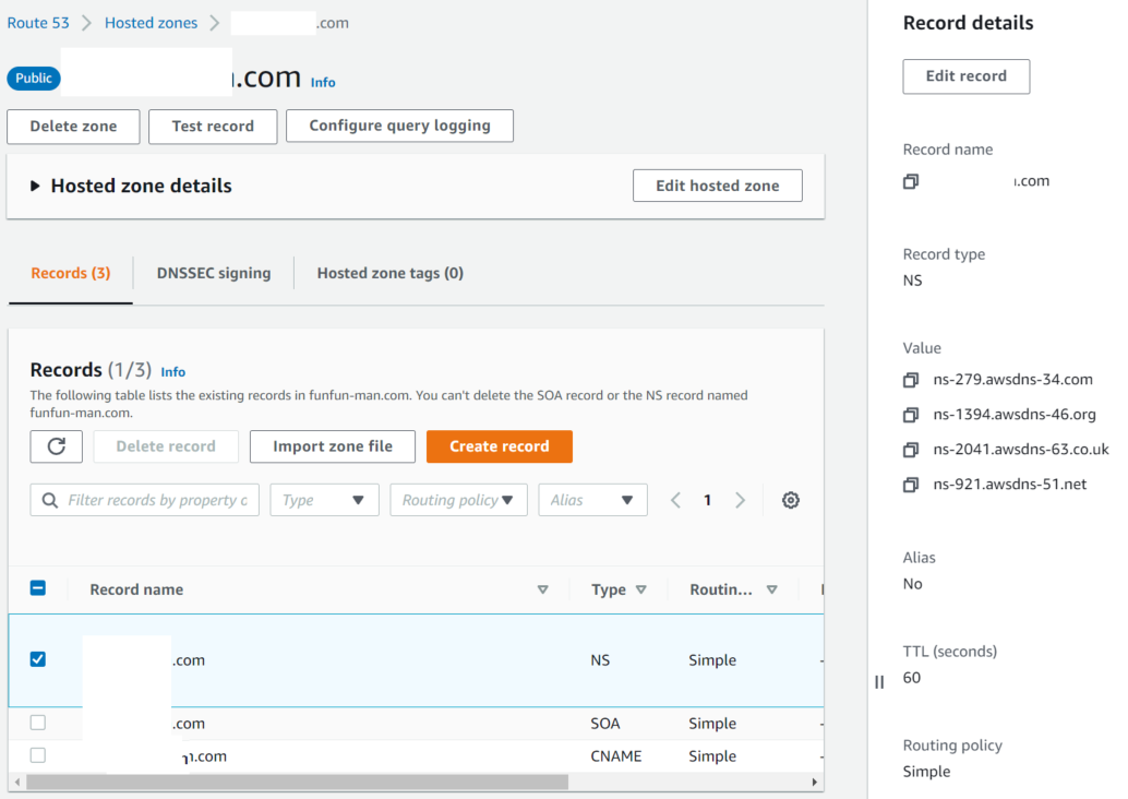 그리고 구입한 도메인을 사용하기 위해서는 새로 Host zone을 만들고, Registered domain과 Host zone의 Name servers를 아래 사진과 같이 동일하게 매핑해주면 된다.