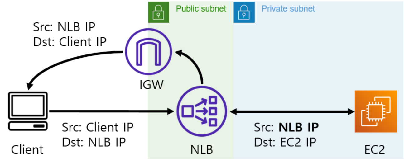 1번의 DSR과 유사한 동작과 다르게 2번과 같이 Private IP로 지정한 Target Group의 경우 기존 방식대로 Request/Response가 모두 LB를 경유하기 때문에 NLB의 장점은 Instance ID일 때 보장 받을 수 있습니다.